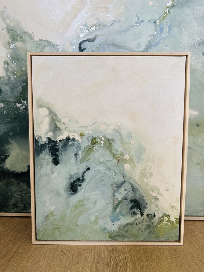 Inspiration often arrives quietly- like a breeze over stone, or light dancing across still water. This piece was born from that quiet place. I wasn't searching for anything specific when asked to do a large commission inspired by the ocean. There are many beach scene artworks out there that are so stunning, but I needed mine to be different. So I let the paint move with intention and instinct, mimicking the way nature carves, softens and reshapes what it touches over time.